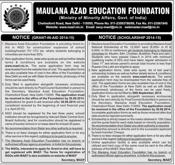 Maulana Azad Education Foundation- Grant-in Aid and Sehat Scheme notices: